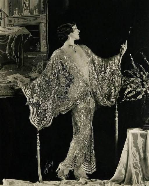 Questi cappotti, influenzati dall’Art Déco e realizzati con tessuti pregiati come velluto o broccato arricchito da fili metallici, offrivano calore e un forte impatto scenografico ai semplici abiti flapper, diventando simbolo di modernità ed esotismo.